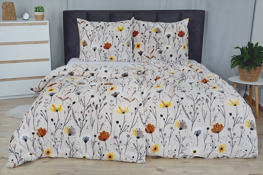 A mikroplüss ágyneműhuzatot elegáns minta látható, tele virágzó virágokkal a sárga, fekete, barna és narancz színek árnyalataiban bézs alapon. Az ágyneműhuzat mikroplüssből (100% poliészterből) készült. Anyaga puha, meleg és kiváló hőszabályozó tulajdonságokkal rendelkezik. 5x több nedvességet képes magába szívni mint a pamut, és gyorsan elpárologtatja azt. Gyorsan szárad és nem gyűrődik, tehát nem kell vasalni. Nem szálasodik és nem szöszösödik. Műszálakból készült, ezért ellenáll a baktériumoknak és az atkáknak. Maximális kényelmet nyújt és tökéletesen kitűnik minden háztartásban. Az ágynemű praktikus húzózárral rendelkezik. A mikroplüss ágyneműhuzathoz a mikroplüss, frottír és jersey lepedők alkalmasak.