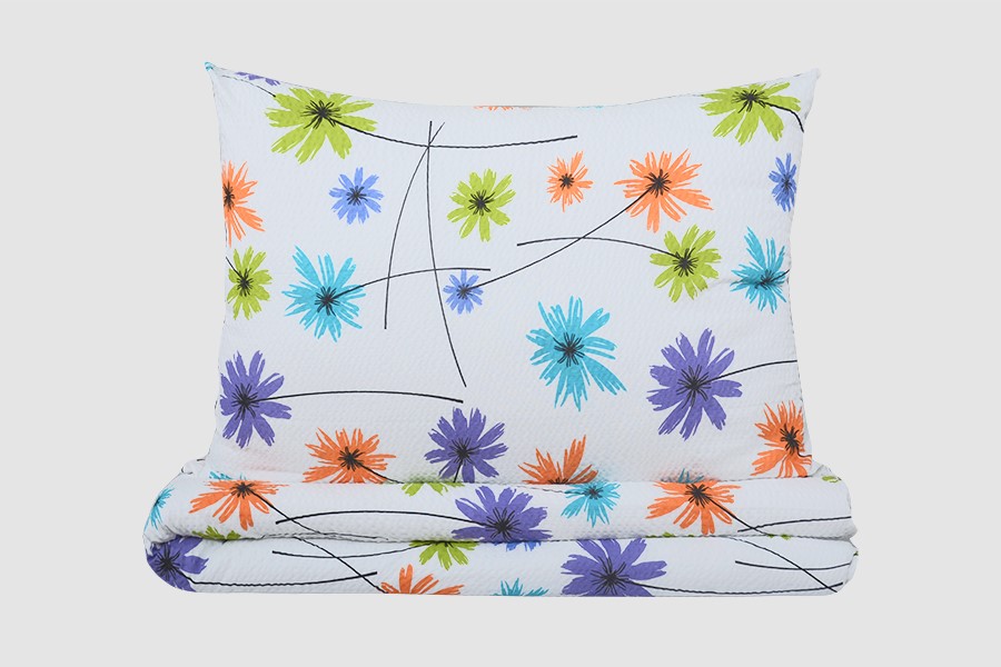 A krepp ágyneműhuzaton apró, stilizált virágok motívuma díszíti mész, narancz, lila és türkiz árnyalatokban, finom fekete vonalakkal fehér alapon. Az ágynemű PLUS pamutból készült, mikroszálas adalékanyaggalépů. A könnyű mikroszálas keverék sok praktikus előnnyel jár. Garantálja az anyag puhaságát, nagyobb gyűrődésállóságát és színtartósságát, így a színek élénkek maradnak még sok mosás után is. A kreppre jellemző a ráncos megjelenés, ami a legnagyobb előnyét hozza, hiszen nem kell vasalni. A lepedők cipzáras záródásúak. Krepplapokhoz alkalmasak a jersey és a frottír lapok.