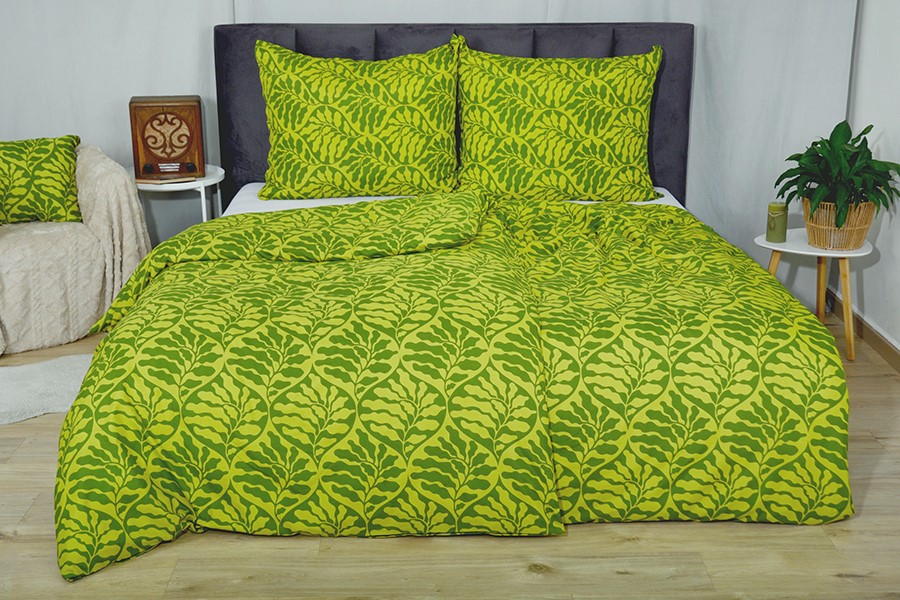 A 4 részes mikroszálas pamuthatású ágyneműhuzat a minta szabályosan ismétlődő, stilizált levelekből áll, amelyek olívazöld és limezöld árnyalataiban jelennek meg. Mivel pamuthatású mikroszálból készült, ezért puha, nem csúszik, gyorsan szárad, könnyű, de ennek ellenére erős. Kitűnő választás allergiások számára, mert baktériumokra és atkákra ellenálló. Praktikus cipzáras kivitelezésű. Kínálatunkból tökéletesen illesztheti ágyához frottír vagy jersey lepedőt, számos árnyalatban kaphatóak.
