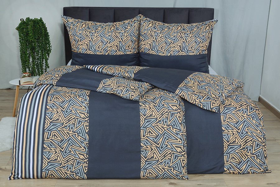 A 4 részes mikroszálas pamuthatású ágyneműhuzat csíkok találhatóak absztrakt mintákkal kombinálva barackszín, szürke és fehér színben, sötétszürke alapon. Mivel pamuthatású mikroszálból készült, ezért puha, nem csúszik, gyorsan szárad, könnyű, de ennek ellenére erős. Kitűnő választás allergiások számára, mert baktériumokra és atkákra ellenálló. Praktikus cipzáras kivitelezésű.