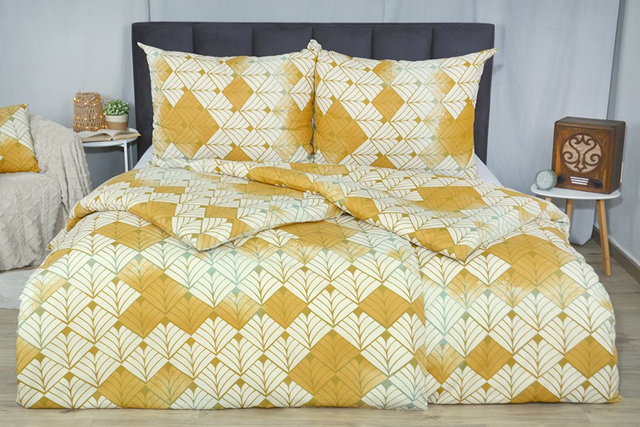 A pamut ágyneműhuzatot meleg arany, tejszínes és zöld árnyalatú motívummal díszítve, amely az Első Köztársaság eleganciáját hordozza magán, és az 1930-as évek stílusos motívumait idézi. Levélszerű mintájával luxusosnak és otthonosnak tűnik, és modern módon adja vissza a hálószobának a régi idők varázsát. Az ágyneműhuzat PLUS pamutból készült, mely kiváló nedvszívó képességgel és légáteresztő képességgel jellemezhető. Bármilyen évszakra alkalmas. A mikroszálas könnyű keverék garantálja az anyag lágyságát és színtartósságát, valamint csökkenti a gyűrődését. Az ágyneműhuzat cipzáras kapcsolással rendelkezik. Az ágyat egy színbe hangolhatja ha vásárol egy frotté vagy jersey lepedőt azonos színben.